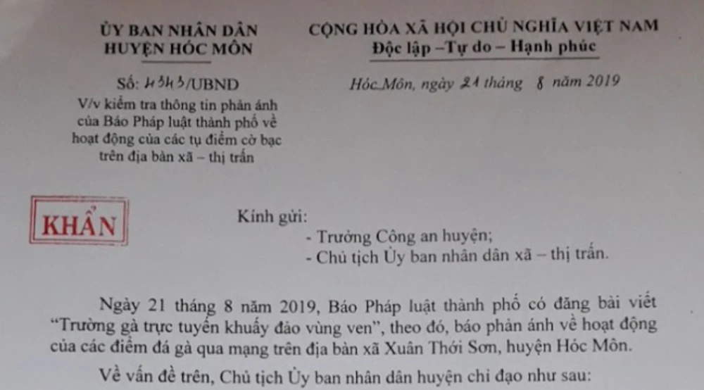 Văn bản chỉ đạo khẩn của chủ tịch UBND huyện Hóc Môn xử lý tình trạng các trường gà trực tuyến trên địa bàn mà Pháp Luật TP.HCM phản ánh