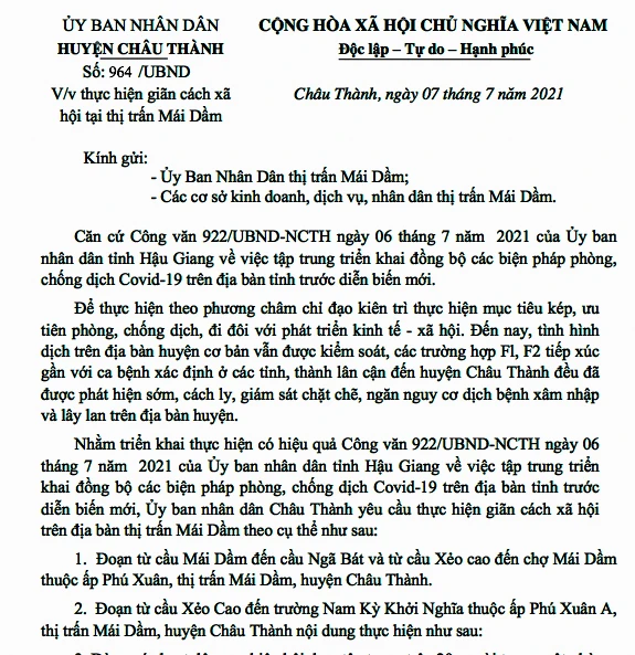 Trước đó, người dân trên địa bàn thị trấn Mái Dầm (huyện Châu Thành) hoang mang, lo lắng khi thấy lan truyền Công văn số 964 về việc thực hiện giãn cách xã hội tại thị trấn Mái Dầm do ông Nguyễn Thanh Phong ký.