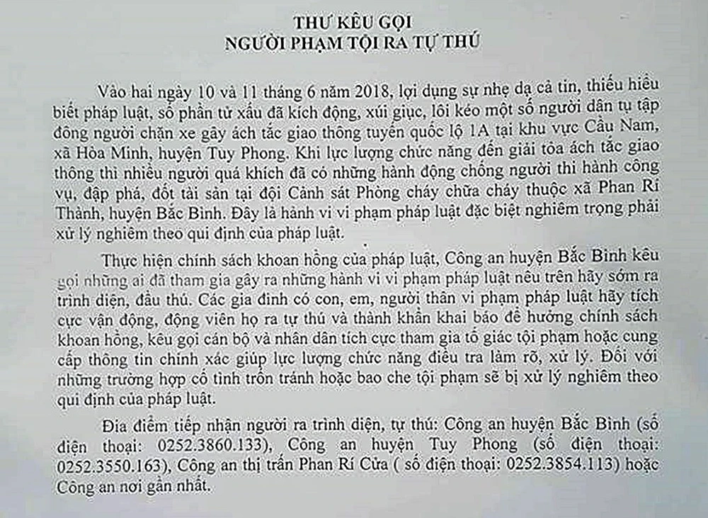 Ngày 14-6, Đại tá Lê Trung Thu, Trưởng Công an huyện Bắc Bình, tỉnh Bình Thuận đã gửi thư kêu gọi người phạm tội ra tự thú.