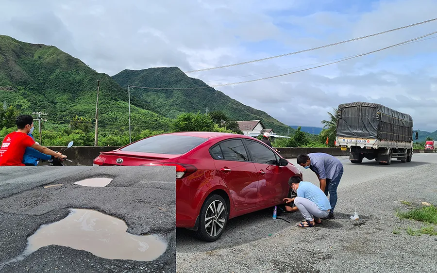 Ô tô bị nổ lốp do sụp ổ gà trên quốc lộ 1 qua Khánh Hòa. Ảnh nhỏ: Một ổ gà trên đoạn đường này. Ảnh: CÔNG NGUYÊN