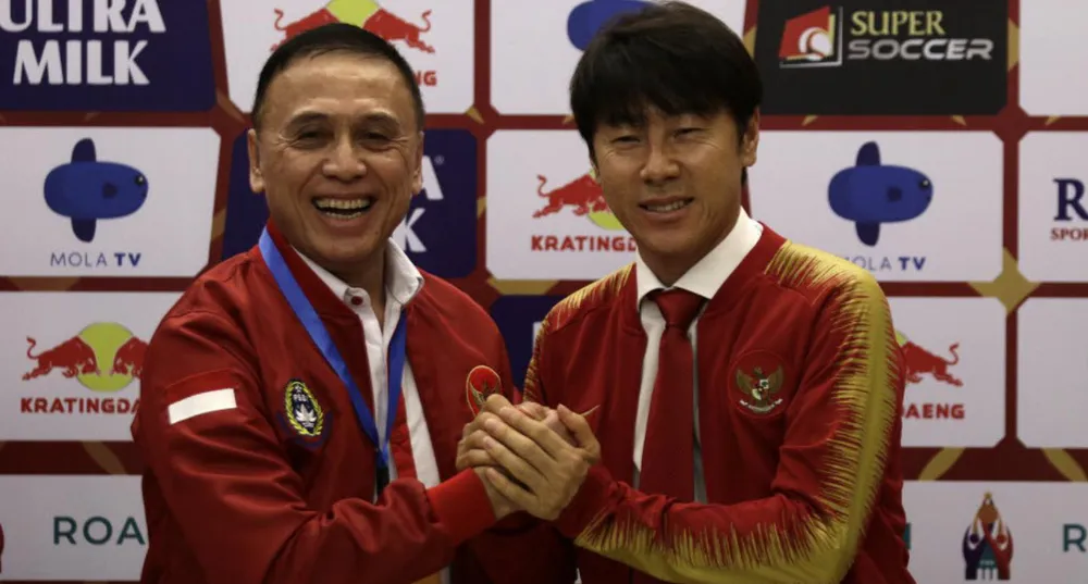 chủ tịch LĐBĐ Indonesia (PSSI) Muhammad Iriawan và HLV trưởng người Hàn Quốc Shin Tae-yong. ẢNH: BOLA
