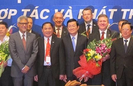 Chủ tịch nước Trương Tấn Sang cùng các đơn vị ủng hộ dự án nhân đạo của Hội Chữ thập đỏ Việt Nam. Ảnh: HH