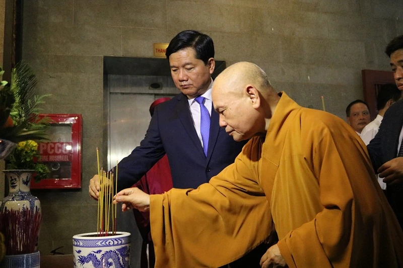 Bí thư Đinh La Thăng thắp nhang tưởng nhớ cùng sư thầy trụ trì.