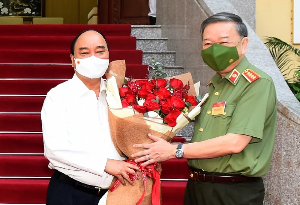 Bộ trưởng Tô Lâm tặng hoa chào mừng Chủ tịch nước Nguyễn Xuân Phúc. Ảnh: BCA