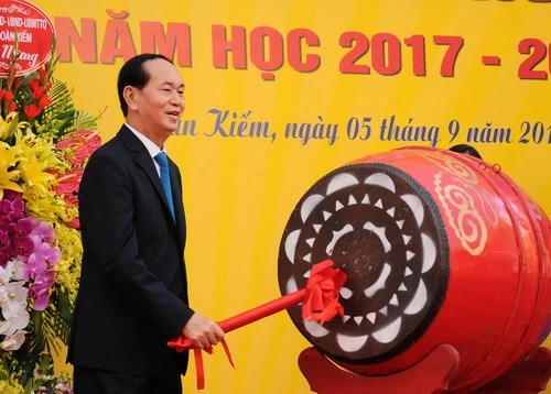 Chủ tịch nước đánh trống khai giảng năm học mới. Ảnh: Giáo dục thời đại