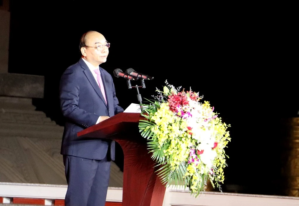 Chủ tịch nước Nguyễn Xuân Phúc phát biểu tại Lễ khánh thành Đền thờ Vua Hùng TP Cần Thơ tối 6-4. Ảnh: CHÂU ANH