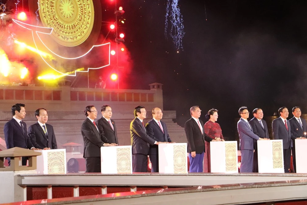 Chủ tịch nước Nguyễn Xuân Phúc cùng nhiều lãnh đạo cấp cao và nguyên lãnh đạo cấp cao thực hiện nghi thức khánh thành công trình Đền thờ Vua Hùng TP Cần Thơ. Ảnh: CHÂU ANH