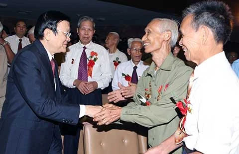 Chủ tịch nước Trương Tấn Sang với các cựu Thanh niên xung phong. Ảnh: TTXVN