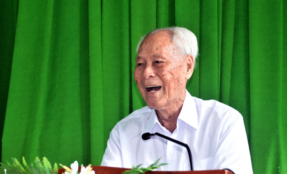Cụ Trần Cang phát biểu tai buổi Lễ trao Thư khen của Chủ tịch nước CHXHCN Việt Nam. Ảnh: QUANG TUẤN