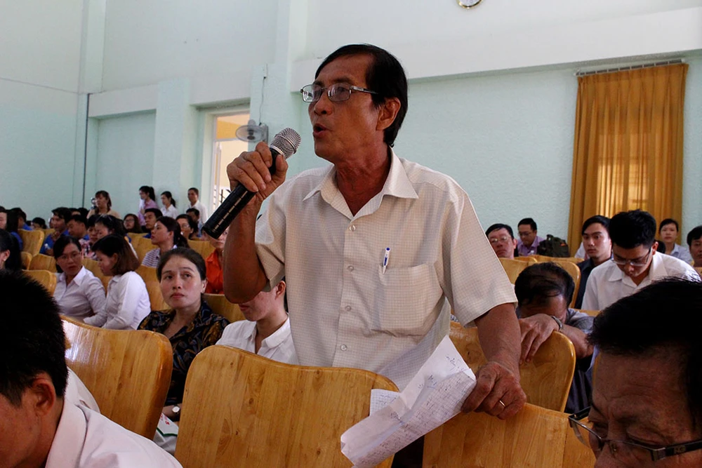 Cử tri huyện Cần Giờ phát biểu trước tại buổi tiếp xúc với Chủ tịch nước Trần Đại Quang. Ảnh: LÊ THOA