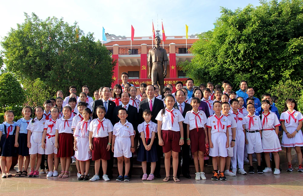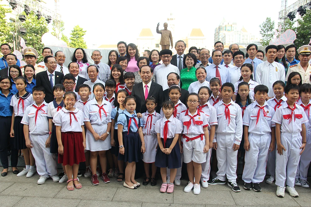 Chủ tịch nước cùng đoàn lãnh đạo TP chụp ảnh lưu niệm bên tượng đài Chủ tịch Hồ Chí Minh.