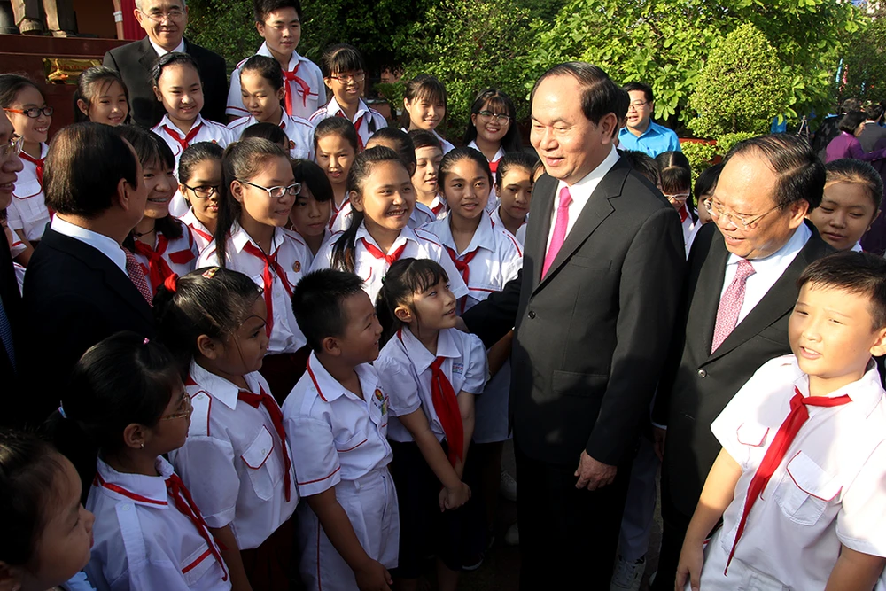 Chủ tịch nước Trần Đại Quang trò chuyện với các em thiếu nhi tại buổi dâng hương.