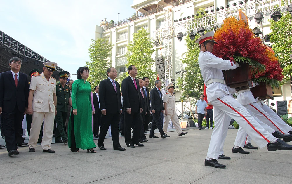 Chủ tịch nước Trần Đại Quang cùng lãnh đạo TP.HCM dâng hoa Bác Hồ trên phố đi bộ Nguyễn Huệ.
