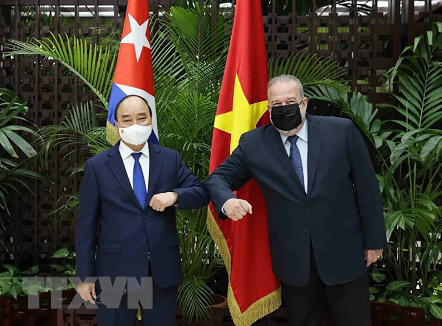 Nhân dịp này, Chủ tịch nước Nguyễn Xuân Phúc chân thành cảm ơn Chính phủ Cuba đã cử chuyên gia y tế Cuba sang Việt Nam và cung cấp hàng nghìn liều thuốc chống dịch COVID-19 và sẵn sàng hợp tác sản xuất vaccine Abdala với Việt Nam.