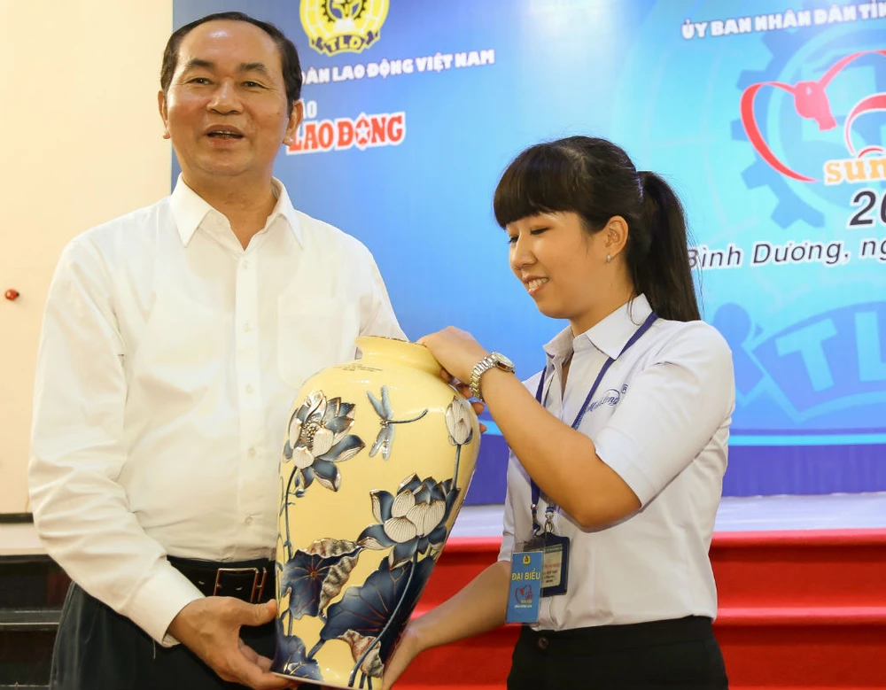 Chủ tịch nước nhận món quà của nữ công nhân Bình Dương. Ảnh: VH