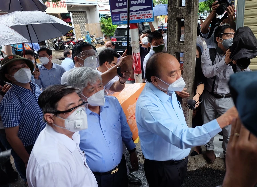 Đúng 15 giờ 30 phút, Chủ tịch nước Nguyễn Xuân Phúc cùng các lãnh đạo TP.HCM đã đến thăm một khu phong tỏa trên đường KP01-10, Khu phố 1, thị trấn Hóc Môn (huyện Hóc Môn).
