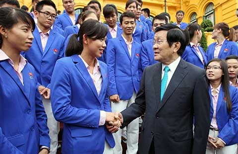 Chủ tịch nước Trương Tấn Sang với các huấn luyện viên và vận động viên đạt thành tích cao tại SEA Games 28. Ảnh: TTXVN