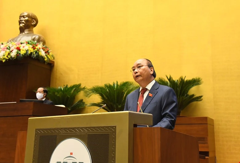 Chủ tịch nước Nguyễn Xuân Phúc phát biểu tại Quốc hội sáng nay. Ảnh: QH