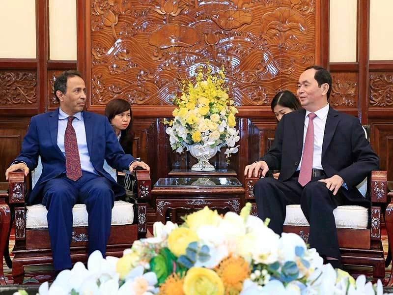 Chủ tịch nước Trần Đại Quang tiếp ngài Khalid Ibrahim Abdulaziz Shohail Al Qahtani, Đại sứ đặc mệnh toàn quyền Các Tiểu Vương quốc Ả-Rập Thống nhất. Ảnh: TTXVN
