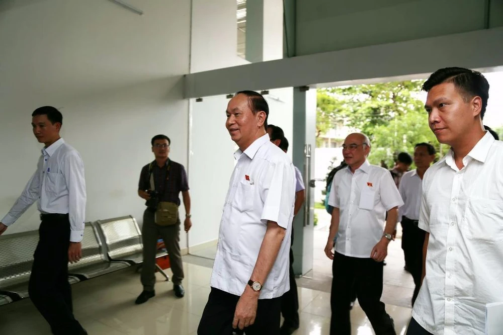 Lúc 13 giờ 45, Chủ tịch nước Trần Đại Quang có mặt tại Hội trường Quận ủy quận 3 tươi cười bắt tay, trò chuyện với cử tri các quận 1, 3 và 4 (TP.HCM). Cử tri TP.HCM cũng bày tỏ vui mừng khi gặp ông.