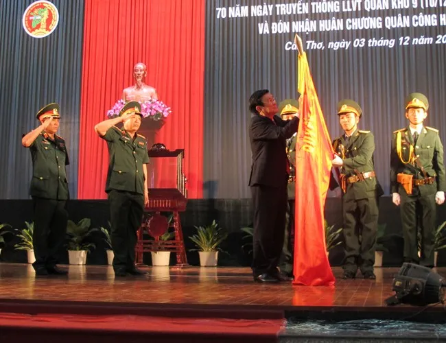 Chủ tịch nước gắn huân chương Quân công hạng Nhất lên cờ truyền thống Quân khu 9. Trải qua 70 năm hình thành và phát triển, LLVT Quân khu 9 luôn sát cánh với Đảng bộ, chính quyền và nhân dân trong cao trào cách mạng đấu tranh giành hòa bình, độc lập, tự do, thống nhất nước nhà. Từ những đội du kích, cảm tử quân đã phát triển nhanh chóng thành nhiều đơn vị cấp tiểu đoàn, trung đoàn và đơn vị binh chủng, được tổ chức hoạt động rộng khắp ĐBSCL cả thành thị và nông thôn làm nên nhiều chiến thắng vang dội như: trận Mộc Hóa, La Bang, Tầm Vu, Đầm Dơi-Cái Nước-Chà Là... và đập tan mọi chiến thuật, chiến dịch của địch… Quân khu có thành tích lớn trong nhiệm vụ bảo vệ Tổ quốc trong thời bình.