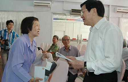 Chủ tịch nước Trương Tấn Sang trao đổi, thăm hỏi cử tri tại cuộc tiếp xúc cử tri quận 1 sáng 16-5. Ảnh: THU HƯƠNG