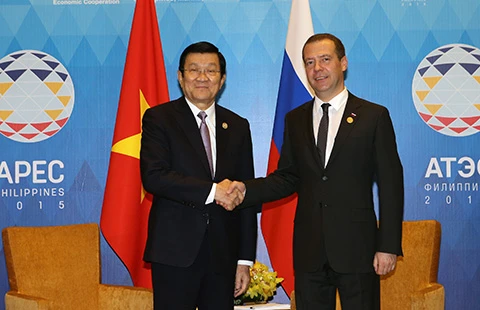 Chủ tịch nước Trương Tấn Sang gặp Thủ tướng Nga Dmitry Medvedev chiều 18-11 tại Manila. Ảnh: TTXVN