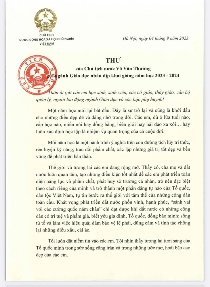 Báo Pháp Luật TP.HCM xin gửi đến bạn đọc toàn văn Thư của Chủ tịch nước Võ Văn Thưởng gửi ngành giáo dục nhân khai giảng năm học mới 2023 - 2024: