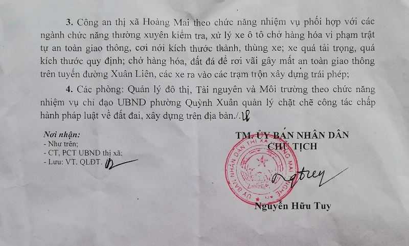Chủ tịch UBND thị xã Hoàng Mai cũng yêu cầu UBND phường Quỳnh Xuân, trong thời gian tới tiếp tục tăng cường giám sát việc đình chỉ hoạt động trạm trộn bê tông thương phẩm của các chủ đầu tư (Công ty TNHH Xuân Hùng và Công ty Xuân Chung) khi chưa có đầy đủ hồ sơ pháp lý theo quy định. Đồng thời yêu cầu Công an thị xã Hoàng Mai theo chức năng nhiệm vụ phối hợp với các ngành chức năng thường xuyên kiểm tra xử lý ô tô vi phạm, các xe ra vào trạm trộn xây dựng trái phép.