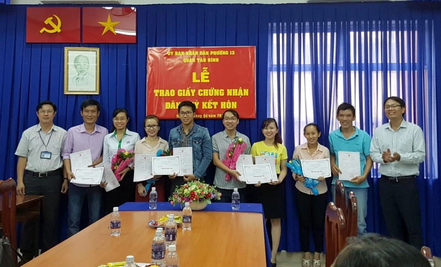 Ngày 27-4, UBND phường 13, quận Tân Bình đã tổ chức Lễ trao giấy chứng nhận đăng ký kết hôn cho bốn cặp vợ chồng gồm: Nguyễn Trung Thành - Trần Thị Kim Hạnh, Nguyễn Lê Vũ - Ngô Lệ Thùy Linh, Tạ Phương Nam - Nguyễn Thị Thu Hằng và Nguyễn Vũ Hoàng Linh - Hứa Hồng Thi.