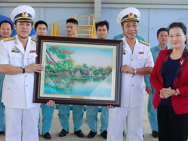 Chủ tịch QH ghi nhận và biểu dương những kết quả đạt được trong huấn luyện làm chủ vũ khí trang bị mới, hiện đại của quân chủng hải quân; tình cảm và trách nhiệm của cán bộ, chiến sĩ hải quân nhân dân Việt Nam với công tác tìm kiếm cứu nạn ngư dân trong những cơn bão vừa qua.