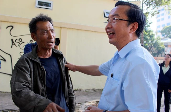 Ông Trần Thế Thuận trong một lần nghe ý kiến của người lao động nghèo mong có chỗ buôn bán ổn định cuộc sống. Ảnh: L.THOA