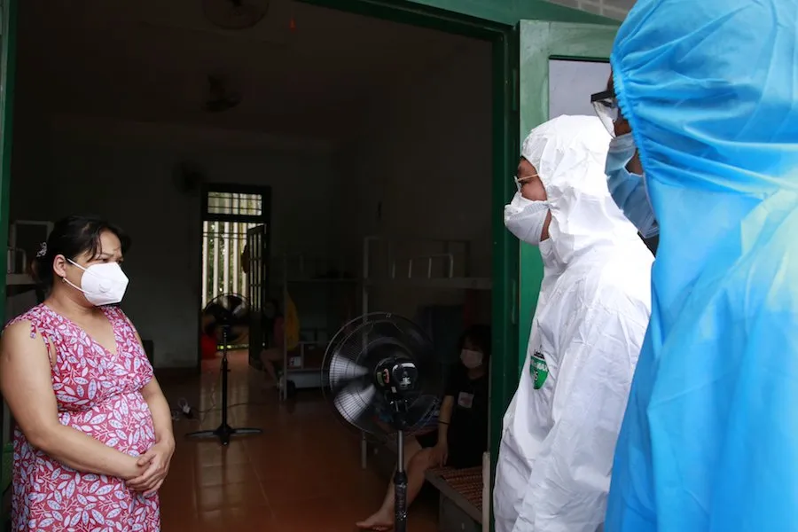 Chủ tịch UBND tỉnh Quảng Nam Lê Trí Thanh (đồ bảo hộ màu trắng) đến thăm đồng hương vừa được đón về từ TP.HCM tại khu cách ly Trường Cao đẳng Quảng Nam.