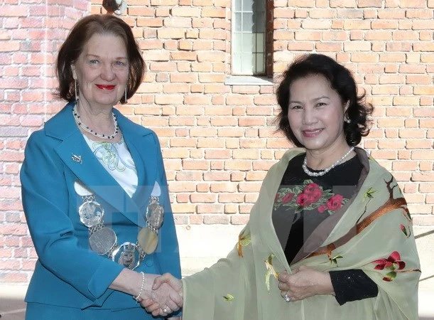 Chủ tịch Quốc hội Nguyễn Thị Kim Ngân gặp Thị trưởng TP Eva Louis Erlandsson Slorach trong trang phục Võ Việt Chung - Ảnh: Trọng Đức/TTXVN