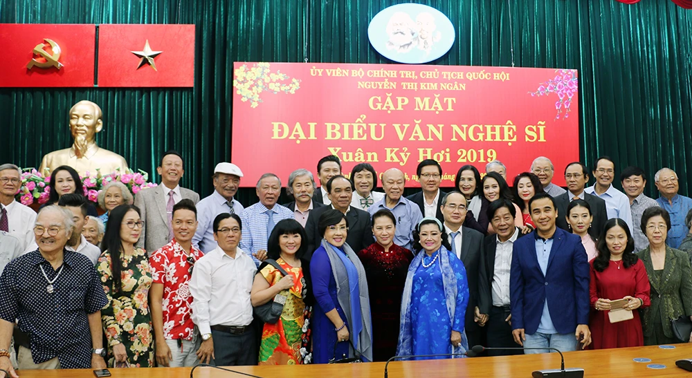 Các văn nghệ sĩ phía Nam chụp ảnh lưu niệm cùng Chủ tịch Quốc hội Nguyễn Thị Kim Ngân. Ảnh: QUỐC VIỆT