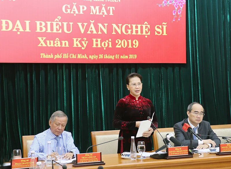 Chủ tịch Quốc hội Nguyễn Thị Kim Ngân phát biểu tại buổi gặp mặt đại biểu văn nghệ sĩ Xuân Kỷ Hợi 2019. Ảnh: QUỐC VIỆT