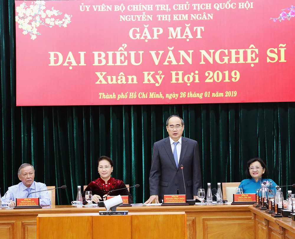 Bí thư Thành ủy TP.HCM Nguyễn Thiện Nhân phát biểu tại buổi gặp mặt đại biểu văn nghệ sĩ Xuân Kỷ Hợi 2019. Ảnh: QUỐC VIỆT