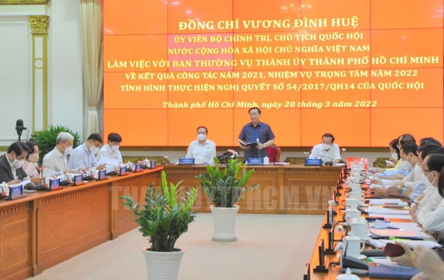Chiều 20-3, Chủ tịch Quốc hội Vương Đình Huệ làm trưởng đoàn công tác của Quốc hội đã có buổi làm việc với Ban Thường vụ Thành ủy TP.HCM về kết quả công tác năm 2021, nhiệm vụ trọng tâm năm 2022 và tình hình thực hiện Nghị quyết số 54 của Quốc hội.