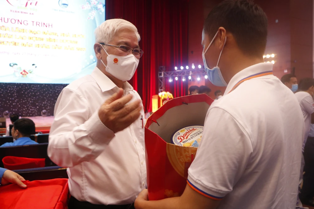 Ông Võ Văn Minh, Chủ tịch UBND tỉnh Bình Dương chúc tết, tặng quà cho công nhân có hoàn cảnh khó khăn đang làm việc tại Bình Dương. Ảnh: LÊ ÁNH
