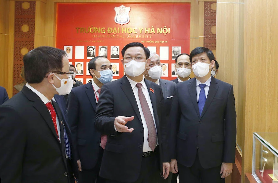 Báo cáo với Chủ tịch Quốc hội, Đại học Y Hà Nội cho biết trong bối cảnh dịch bệnh, đây là trường đại học duy nhất sinh viên vẫn duy trì học tập bình thường. Khi các đợt dịch tiếp tục bùng phát với diễn biến phức tạp, thầy và trò nhà trường cùng chung tay chi viện, hỗ trợ một số điểm nóng dịch trên cả nước như Bắc Ninh, Hải Dương, TP.HCM, Bình Dương… Ngoài ra, Trường còn mở các lớp đào tạo trực tuyến miễn phí về chẩn đoán, điều trị và chăm sóc cho bệnh nhân COVID - 19 cho tất cả nhân viên y tế và người dân cả nước. Chương trình được thực hiện trong hai tháng, với hơn 20 nghìn lượt người tham gia.