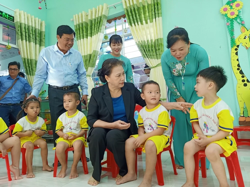Chủ tịch Quốc Hội Nguyễn Thị Kim Ngân, áo đen ngồi giữa thăm các cháu thiếu nhi ở vùng Căn Cứ Tân Hưng (Ảnh: CTV).