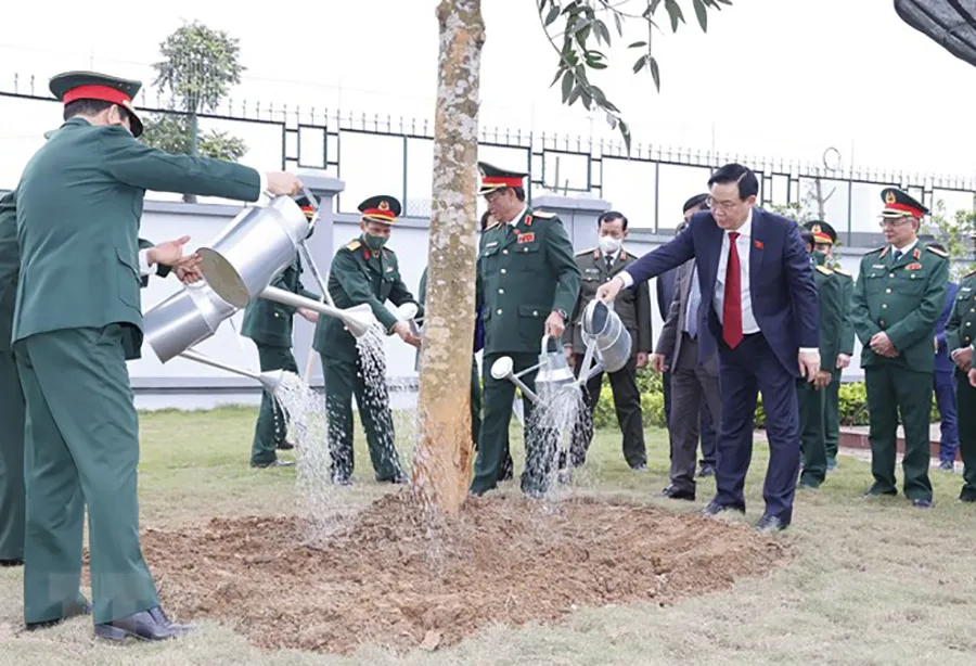 Chủ tịch Quốc hội trồng cây lưu niệm tại Tổng cục II. Ảnh: TTXVN