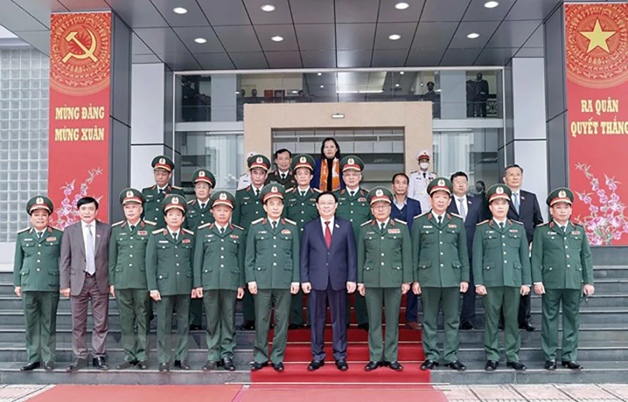 Chủ tịch Quốc hội Vương Đình Huệ với lãnh đạo, sỹ quan chỉ huy Tổng cục II. Ảnh: TTXVN