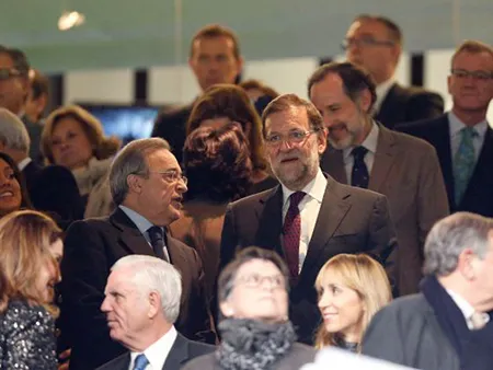 Chủ tịch Perez (giữa, bên trái) trò chuyện cùng Thủ tướng Tây Ban Nha Mariano Rajoy khi cả hai dự khán trận El Clasico đêm thứ Bảy qua.