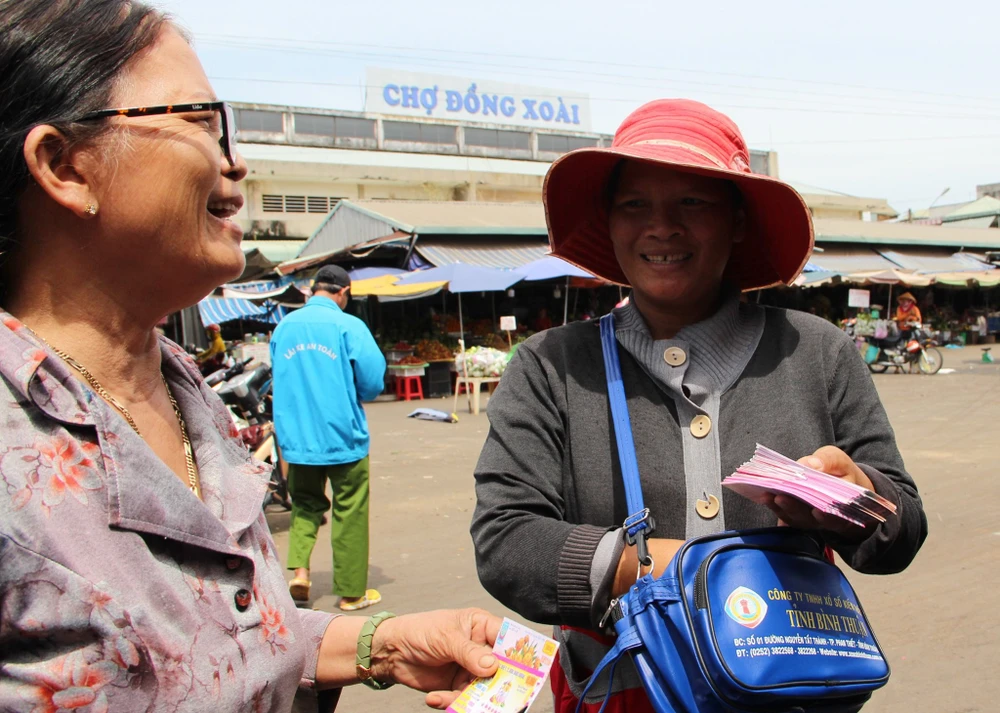 Chị Mai đang đi bán vé số. Ảnh: ĐÌNH TRỌNG