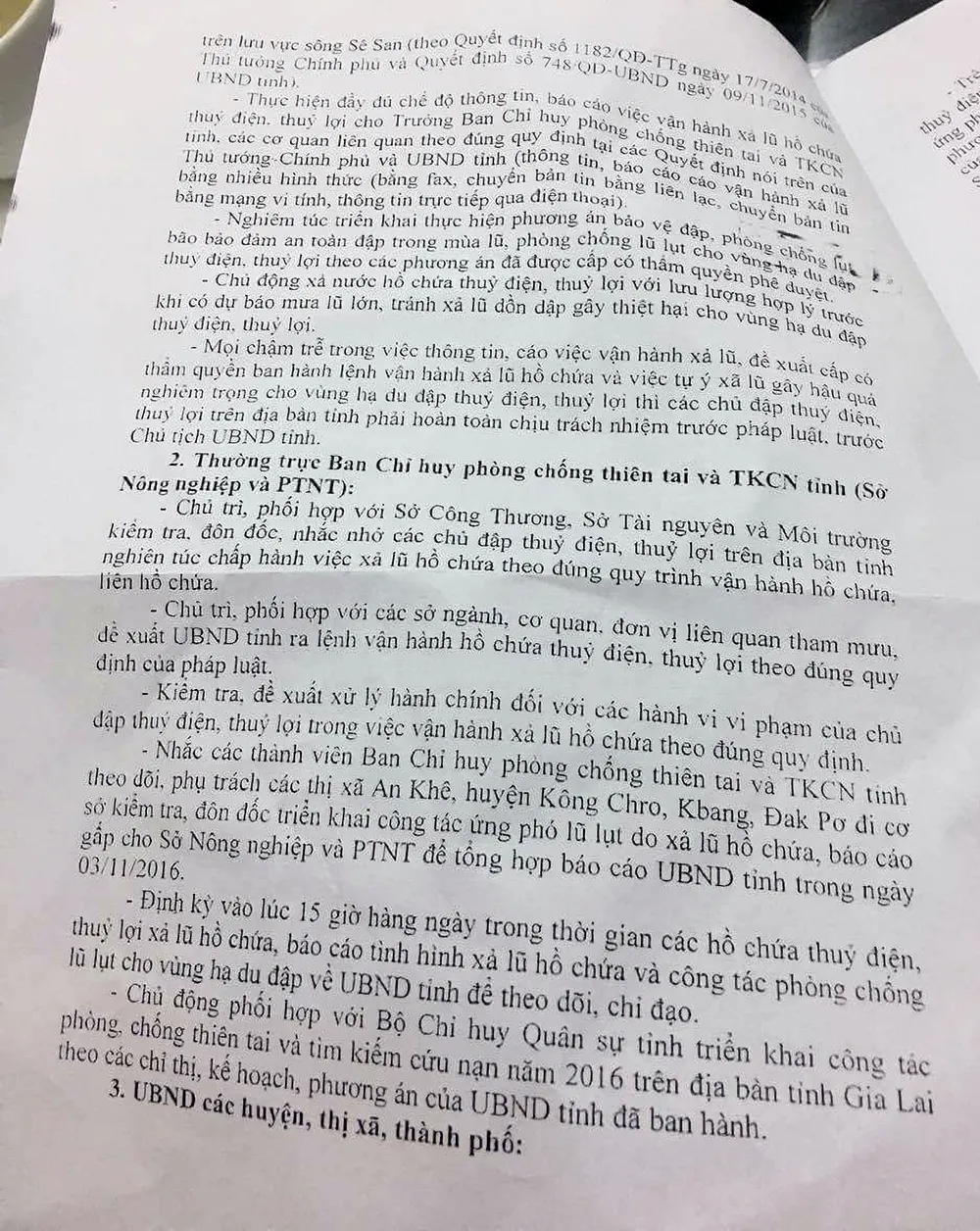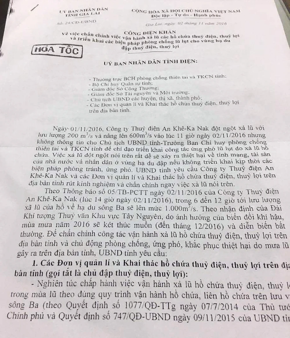 Theo công văn này, vào ngày 1-11, thủy điện An Khê - Ka Nak bất ngờ xả lũ với mức nước 200 m3/giây và đến 11 giờ ngày 2-11 thì nâng mức xả lũ lên 600 m3/giây.