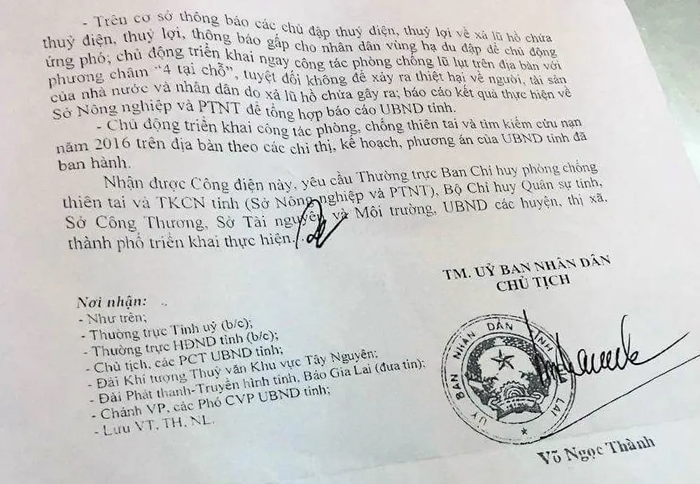 Chủ tịch UBND tỉnh Gia Lai Võ Ngọc Thành vừa ký Công văn hỏa tốc số 24/CĐ-UBND về việc chấn chỉnh vận hành xả lũ các hồ chứa thủy điện, thủy lợi và triển khai các biện pháp phòng, chống lũ lụt cho vùng hạ du đập thủy điện, thủy lợi.