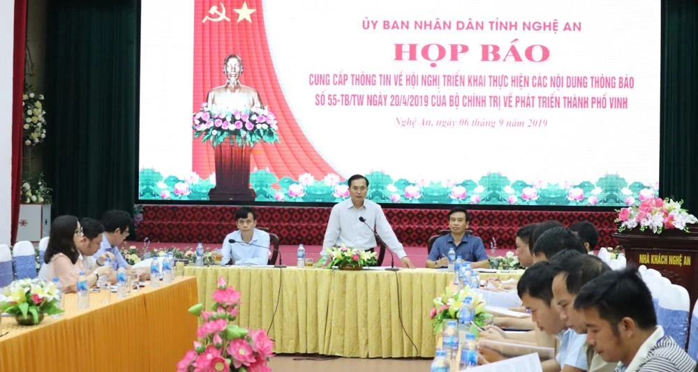 Sáng 6-9, UBND tỉnh Nghệ An tổ chức buổi họp báo cung cấp thông tin về hội nghị triển khai thực hiện các nội dung Thông báo số 55-TB/TW của Bộ Chính trị về phát triển kinh tế TP Vinh (Nghệ An).