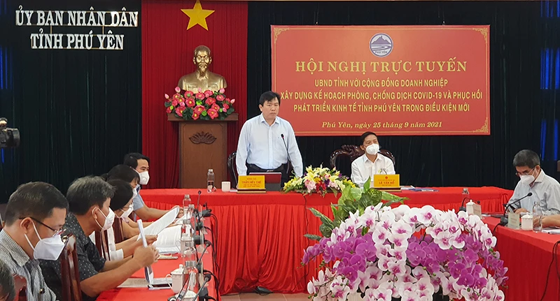 Ông Trần Hữu Thế, Chủ tịch UBND tỉnh Phú Yên (đứng), chủ trì hội nghị lấy ý kiến của doanh nghiệp để khôi phục sản xuất kinh doanh. Ảnh: TẤN LỘC