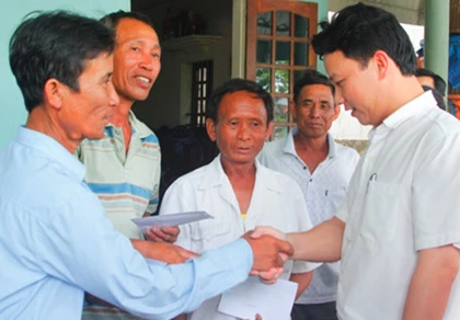 Ông Đặng Quốc Khánh (phải) bắt tay động viên, trao quà cho ngư dân Phạm Văn Lệ, các ngư dân cùng quê huyện Lộc Hà (Hà Tĩnh) có thành tích phát hiện, cứu Thiếu tá phi công Nguyễn Hữu Cường trong vụ chiếc Su-30 gặp nạn.